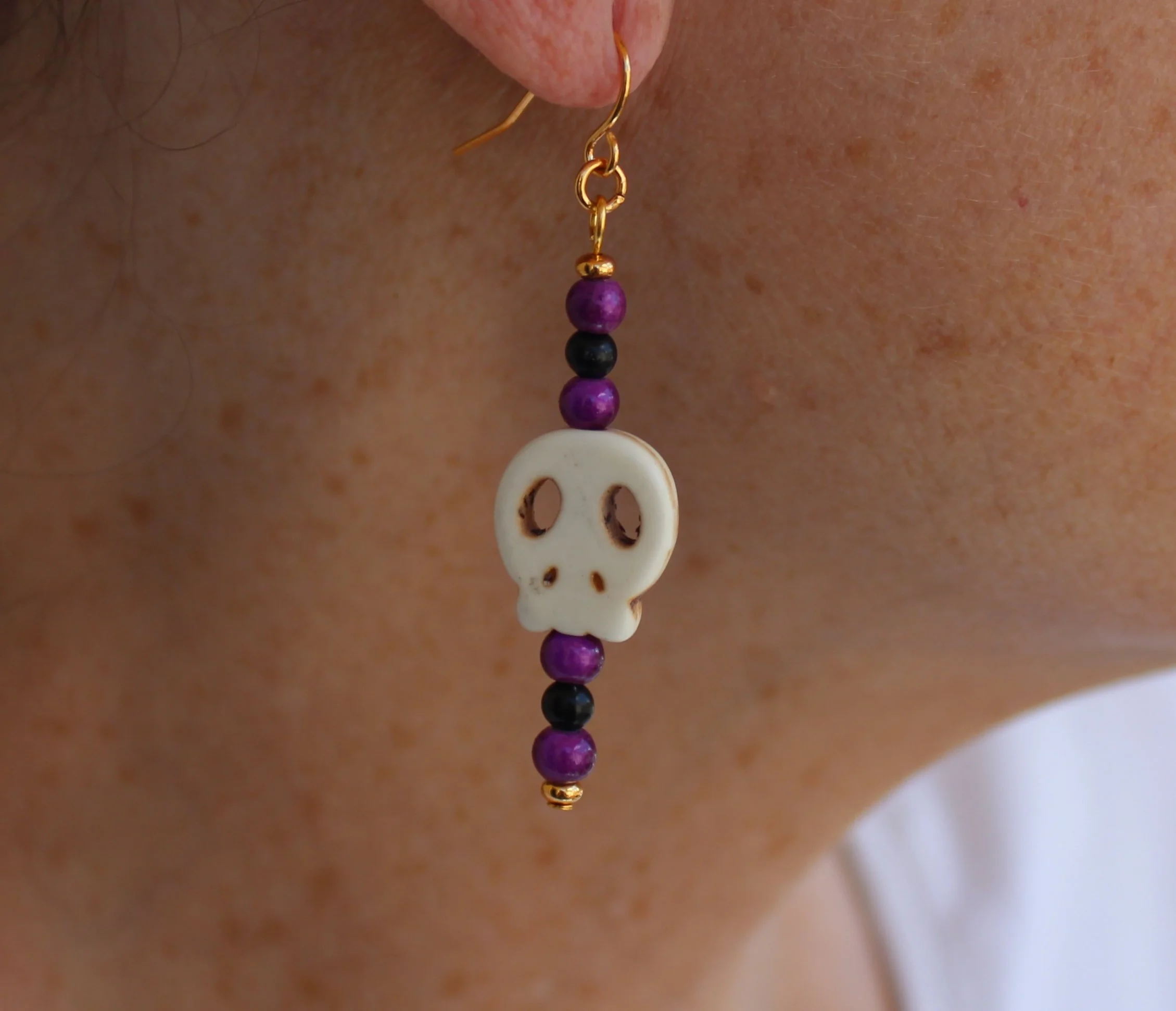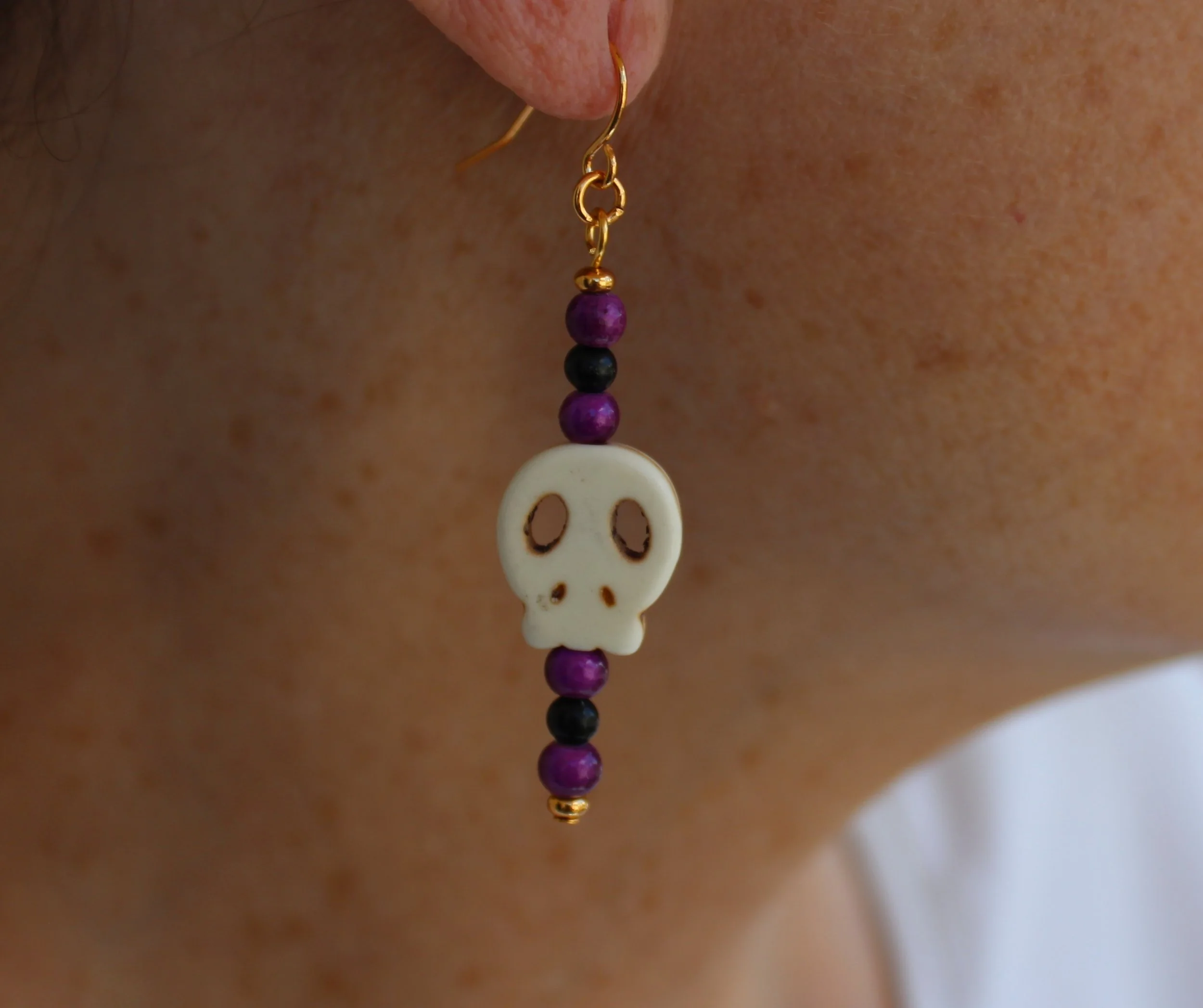 Silver skull earrings with faceted black beads on silver ear wires. These earrings are approx 1 ¾ inches long. Great for Halloween or as a goth gift.